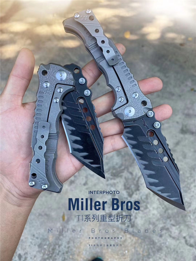 米勒T-1系列重型战术折刀 型号:M-1 全长:21.3CM 刃长:9CM 宽度:4.6CM 刃厚:0.5CM 刃材:Z-Wear工具钢A8 硬度:60HRC 刀柄:TC4钛合金手工+CNC 刀夹:TC4钛合金手工 重量:200G 产地:美国公司授权中国大陆代工 表面效果:镀钛发黑石洗做旧 包装:手工复古盒子