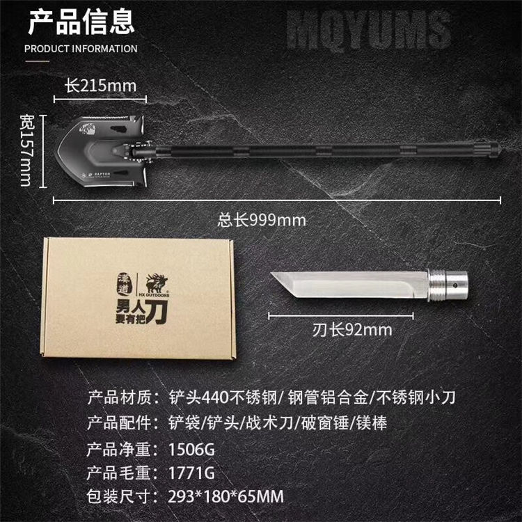 汉道猛禽兵工铲 五档卡位,一秒转换,手柄螺旋直接卡扣,快速组装,铲面升级结合小刀/打火棒/镁棒/哨子/尾锥多种功能,四节手柄,使用更灵活,车载户外必备工具