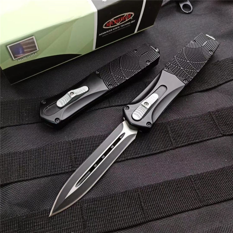 微技术网纹直出跳刀 全长:23cm 刃长:9cm 刃厚:3mm 刃宽:1.5cm 柄长:14cm 刃材:3洛钢 硬度:57 柄材:不锈钢柄 刀套:尼龙套 备注:带腰夹