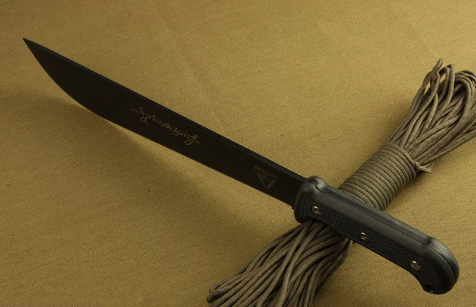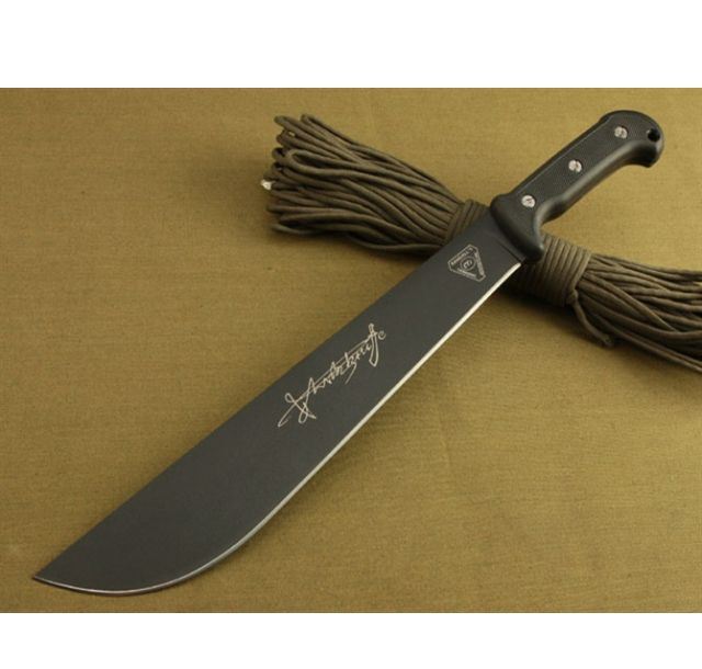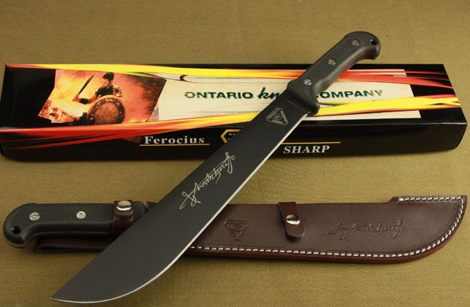 安大略—签名版野营刀(喷吵黑色) 全长:48.6cm 刃长:34.5cm 柄长:14.2cm 刃厚:5.3mm 刃宽: 5.6cm 刃材: 5Cr13 柄材: ABS 硬度: 57HRC 毛重:800克(含包装物) 表面处理:氧化黑