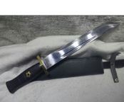 全长:45 cm 刃长:27 cm 柄长:15 cm 刃宽:3.5 cm 刃材:百炼花纹钢研磨 装材:铜配件,黑檀手柄 硬度区间:60HRC 性能:全开锋,削纸断竹砍铁 备注:手工产品存在误差,规格仅供参考,请以实物为准!