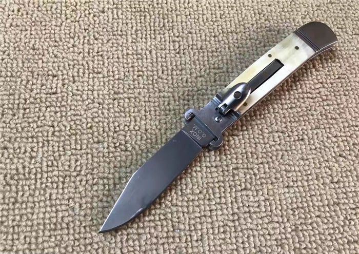 7.7英寸Shell puller古董跳刀(花牛角柄) 全长:19.6CM 刃长:8.5CM 刃厚:3MM 刃材料:440 硬柄材料:双纯钢护手+花牛角
