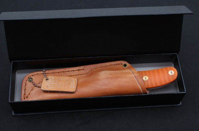 全 长:213mm 刃 长:100mm 柄 长:113mm 刃 宽:32mm 刃 厚:5.0mm 刃 材:AUS-10 重 量:425g(含包装) 硬 度:59HRC 表 面:沙光 柄 材:桔红G10 (半透光) 锁 型:定锁 其 他:配牛皮套+彩盒