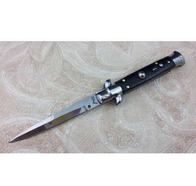 9寸意大利黑手党跳刀(仿牛角) 全 长:22.9CM 刃 长:10.2CM 柄 长:325MM 刃 厚:3.0mm 刃 材:440 刀 柄:亚力克黑牛角 开刀方式:弹簧 重 量:150克 2014新款9寸AKC意大利黑手党-赌徒跳刀,在电影"教父"里出尽了风头!枪刺刃的黑手党侧跳,仿牛角亚力克柄,弹力超强,锁定到位,440枪刺刀刃镜面,带有保险装置,刀护手处暗藏闭合开关,出口产品,质量保证!满足把玩和收藏需要