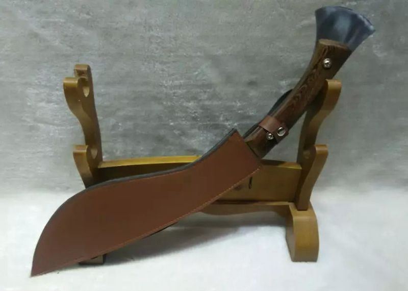 全长:60cm 刃长:36cm 柄长:24cm 刃宽:9cm 刃厚:0.6cm 刃材:高碳钢 硬度区间:刃口59HRC 刀身:56HRC 加工工艺:百炼高碳钢,手工折叠锻打,传统古法13道研磨。 柄材:花梨木+铆钉 鞘材:皮套 总重:1380g (含皮套及锦盒) 性能:削纸断竹砍铁丝 备注:手工产品存在误差,规格仅供参考,请以实物为准! 温馨提示:本品不含刀架,刀架需另购,谢谢