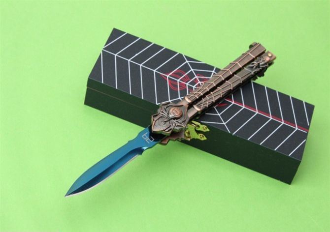 29蜘蛛黑寡妇甩刀(蓝钛版) 全 长:224mm 刃 长:68mm 柄 长:140mm 刃 宽:15mm 刃 厚:2mm 刃 材:440C 重 量:210g(含包装) 硬 度:57HRC 表 面:蓝钛 柄 材:铸钢 锁 型:甩刀 其 他:配高档木盒