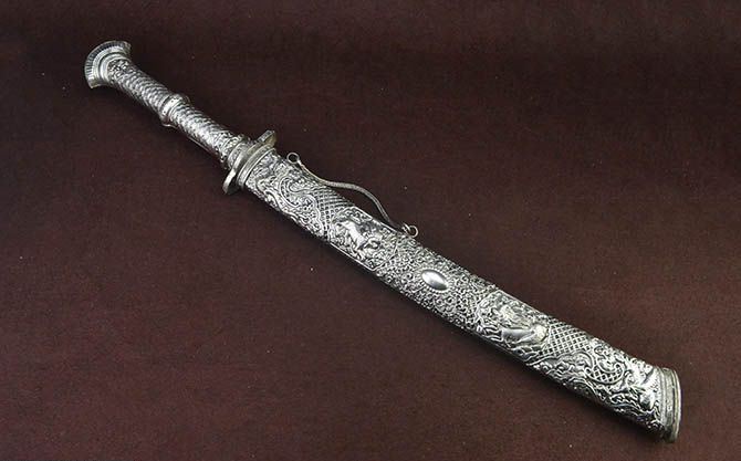 鞘材:采用藏银纯手工制做,内装木芯以保护刀刃。