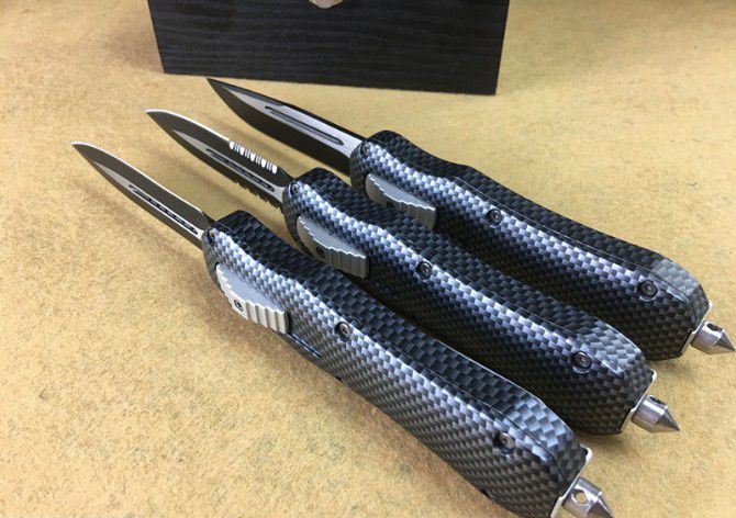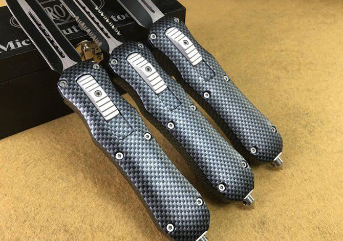 伤齿龙Z123碳纤维直出跳刀 全 长: 20.5cm (含尾锥长度) 刃 长: 8.5cm 刃 厚: 2.8mm 刃 材: 440 硬 度: 57HRC 刀净重:300克 总重量: 500克(含包装物) 表 面: 黑白(刀刃) 柄 材: 仿碳纤维 刀 鞘: 尼龙 锁 闭: 弹簧直出 备 注:带背夹和玻璃撞针