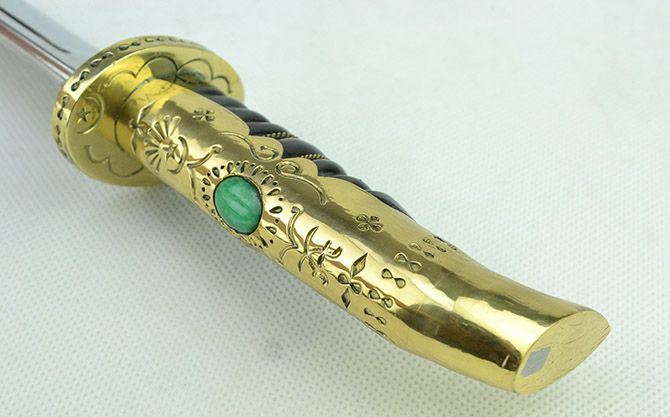 全长:47cm 刃长:34.5cm 刃宽:3cm 刃厚:0.61cm 刃材:弹簧钢 柄长: 11.3cm 重量:820克(含鞘) 鞘材:木+鞘背包铜 装材:铜+牛角+绿松石 柄材:铜+牛角+绿松石 硬度区间:60HRC 性能:手工精细研磨全开锋,削纸断竹、削发如泥。 备注:手工产品存在误差,规格仅供参考,请以实物为准!