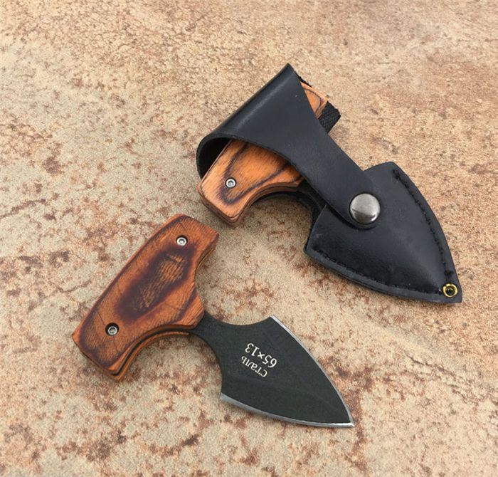 木柄黑刃小手刺 全长:8.5cm 刃长:5.5cm 刃厚:3.5mm 刃材:440A 硬度:57HRC 表面:磨砂 柄材:彩木 木柄小手刺,双刃,一体龙骨,小巧便携