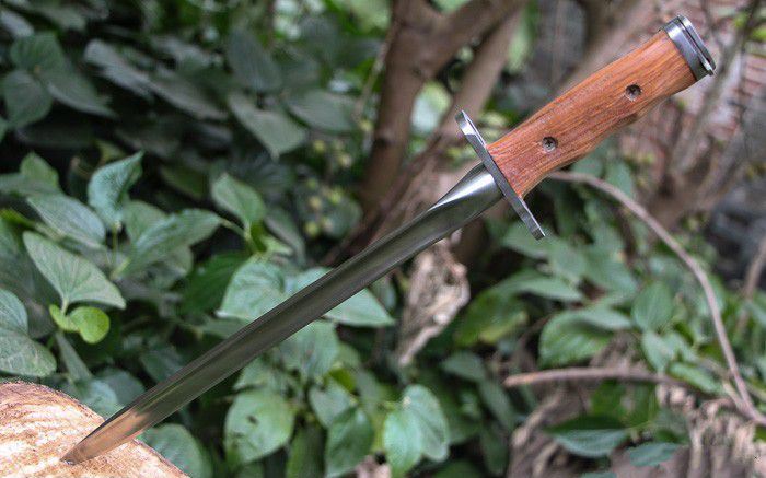 三棱军刺大号(钢本色) 长 度:40CM 刃 长:28.5CM 刀直径:2.1CM 净 重: 450g 硬 度: 56HRC 刀材质:430高碳不锈钢 柄 材:原木 附皮革刀套。