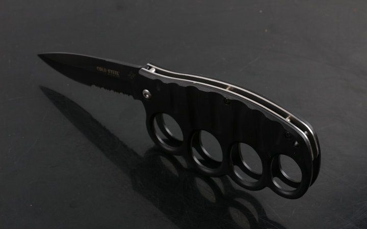 冷钢219半齿拳套折刀 全 长:20cm 刃 长:8.5cm 柄 长:11cm 刃 厚:0.28cm 刃 材:7Cr17 柄 材:铝 硬 度:58HRC 表 面:氧化黑 重 量:170g