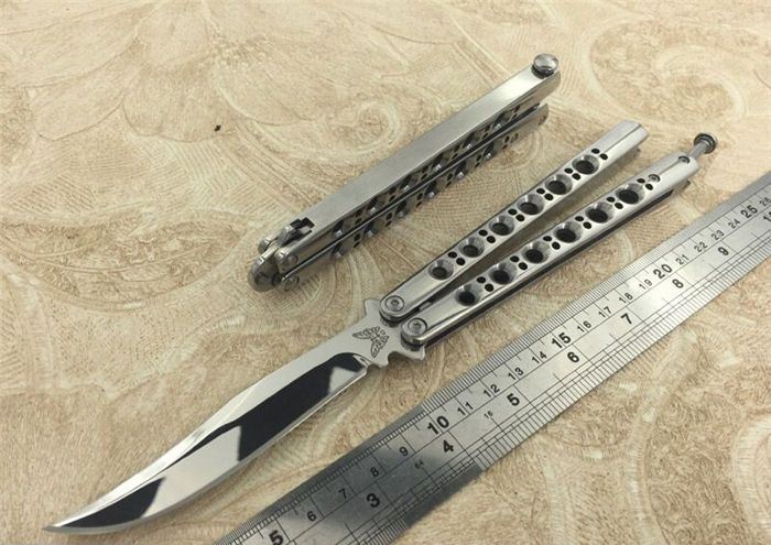 THE ONE镜面款BM43蝴蝶甩刀 全长:24CM(打开) 刃长:9.5CM 刃厚:0.3CM 刃材料:进口440C 硬度:59-60 重量:150克 刀鞘:刺绣尼龙刀鞘 铸钢柄镂空,压弹出刀 THE ONE 镜面款BM43甩刀,由The one (唯一)精工打造,是现成BM系列精加工特制款式,经典BM43刃,一体柄型,刀刃选用高级440C钢,经精工细作的镜面抛光打造而成,螺丝扣锁都经过严格调配,小批量的精品甩刀