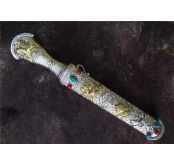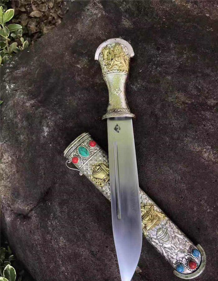 全手工雕刻白铜鞘材镶嵌红绿宝石,刃材采用弹簧钢锻打硬度60左右可以砍铁不伤刃