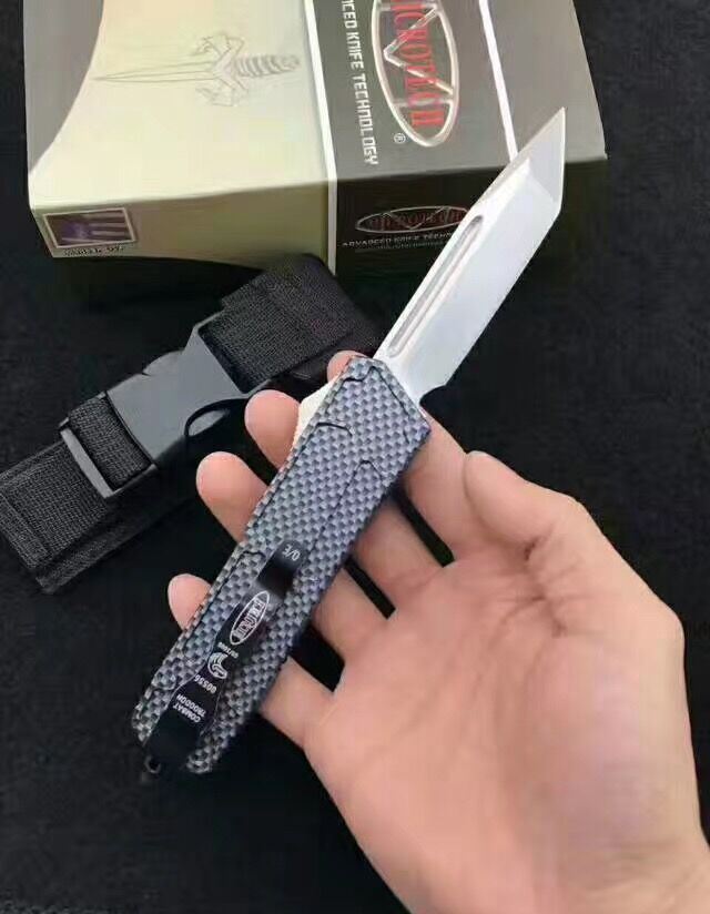 微技术MICROTECH死神直跳刀 全 长:21.3cm (含尾锥长度) 刃 长:8.5cm 刃 厚:2.6mm 刃 材:440 硬 度:57HRC 重 量:301.0克(含包装物) 表 面:黑白拉丝(刀刃) 柄 材:扎花凸图案锌铝合金 刀 鞘:尼龙 锁 闭:弹簧直出 备 注:带背夹