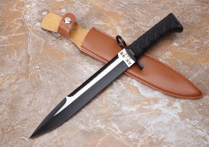 Ak99军刺 全长:43cm 刃长:29cm 柄长:14cm 刃厚:5.8mm 刃材:5CR17 柄材:ABS 硬度:58HRC 净重:390g 毛重:710g 表面:拉丝,发黑 刀套:仿革套