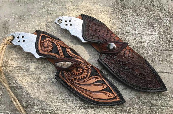 祥云大马士革直刀雕花皮纯 总长:18cm 刃长:8.5cm 刃厚:4MM 刃宽:3.6cm 钢材:无芯折叠锻造大马士革钢 硬度:60HRC,真空深了热处理 皮套:阿根廷进口植鞣皮纯收工缝线雕花,镶嵌蛇皮唐草收工雕刻