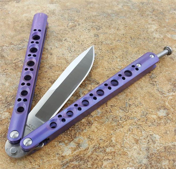 经典紫色钛柄蝴蝶甩刀BM42复刻版 全长:23.3CM(打开) 刃长:9.5CM 刃厚:0.3CM 刃材料:440C不锈钢 表面:钛柄氧化紫色 硬度:58 重量:115克 刀鞘:尼龙刀鞘 由The one (唯一)精工打造,刀柄选用一体T-4钛经数控车床(CNC)加工而成,整体重量115克,1:1复刻原版,蝴蝶标,刀刃选用优质440C刀刃,数控精磨,搭配高品质丝扣等,精工细活,为广大甩刀迷打造经典蝴蝶甩刀