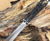 the one BRS蝴蝶甩刀(黑灰) 全长:254MM 刃长:114MM 开刃长:107MM 刃厚:3.5MM 刃材料:D2 刃型:tanto 柄长:140MM 柄厚:14MM 柄材料:G-10 柄颜色:黑/灰 柄内衬:钛 重量:150克 BRS系列,bushing轴套系统,搭配钛内衬,G10轻质高强手柄,重量只有150克。转动非常顺畅,D2刃材,数控精磨