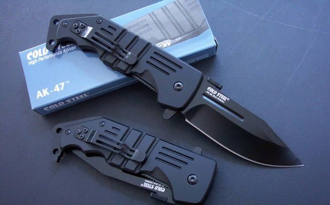 冷钢AK-47战略折刀(半自动) 全长:21.5CM 刃长:8.5CM 刃厚: 0.3CM 刃宽:3.2CM (最宽处) 柄长: 12.8CM(闭合) 柄厚: 1.2CM 涂层:发黑 柄材: 航空铝 净重:150克 锁定:线锁,半自动 其他:带腰夹,可左右手转换