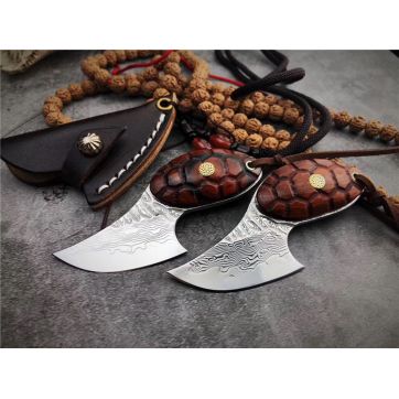 大马士革忍者龟吊坠刀 总长:9cm 刃长:5cm 刃厚:3.0mm 钢材:进口锻造大马士革VG10钢95层,真空冷热处理 硬度:60-61HRC 柄材:黄檀实木雕刻龟甲纹 配置:手工缝制头层牛皮套 95层进口锻造大马士革VG10钢打造,真空深冷热处理,硬度58-60HRC,优点:极其锋利度出色,韧性锋利保持度非常稳定。刀柄雕刻龟甲纹,寓意富甲天下一把个性十足的香刀,配置纯手工缝制头层牛皮刀套,可作配饰吊坠刀。喜欢的友友们不可错过