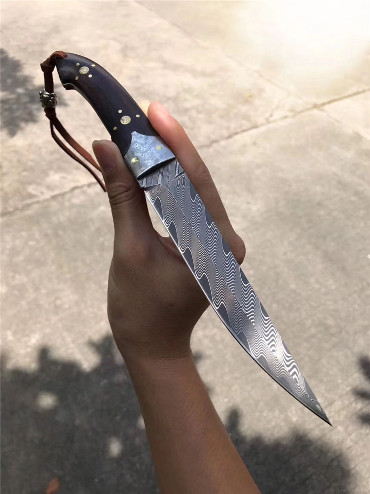 大马士革罗曼大师直刀 总长:26.5cm 刃长:14.2cm 刃厚:3.5mm 刃宽:2.6cm 重量:162g 钢材:美国锻造大马士革钢VG10钢材,韧性锋利度保持性非常好 硬度:60-62HRC 热处理:真空深冷油淬热处理 结构方式:一体龙骨结构锻造大马,钢头采用大马钢,镶嵌花钉固定 柄材:进口大叶紫檀木 皮套:意大利进口优质植鞣皮,国内专业手工大师制作,纯手工缝线着色 包装:手工盒子包装