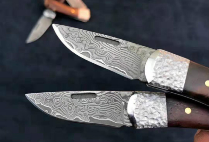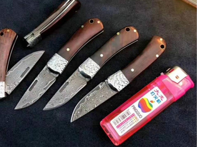 大马士革小松豆折刀 总长:10.3cm 刃长:4.3cm 折合长:5.8cm 厚度:2.2mm 刃材:大马士革钢 硬度:59-60HRC,真空热处理 柄材:微粒黄檀木 包装:迷你小礼品盒包装