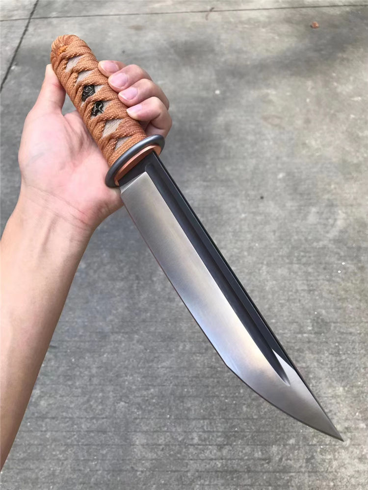 华匠坊战虎坦托直刀 总长:360mm 刃长:217mm 柄长:143mm 厚度:6.7mm 刃宽:41mm 钢材:DC53 硬度:59HRC 净重:520g