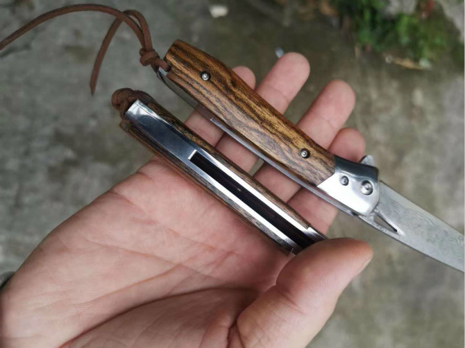 大马士革战影折刀 总长:19.5cm 刃长:8.6cm 刃宽:2.1cm 刃厚:3.3MM 钢材:VG10芯层大马士革钢,真空深冷热处理,硬度59HRC 开合方式:单手轴承快开 轴承:进口滚珠轴承 钢头:进口67层大马士革钢 柄材:名贵黑胡桃蛇纹木 背骨雕花,配皮绳子 皮套:进口植鞣皮手工缝线 盒子:硬盒子礼盒包装 一款是高端名贵收藏级玩家必备用战术折刀,送朋友领导必备品,高端好东西不要错过