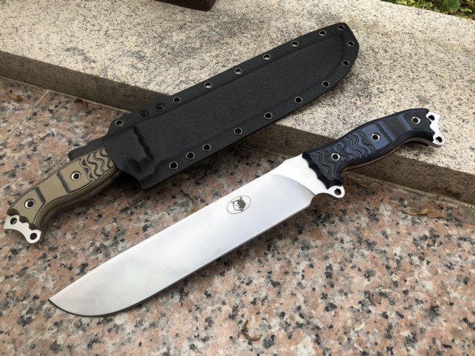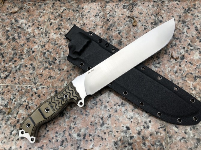 野狼战神直刀 全长:415mm 刃长:260mm 刃宽:48mm 柄长:145mm 钢材:进口Dc53 硬度:60/61真空油淬 柄材:进口G10 重量:895g含 刀鞘:配进口K鞘